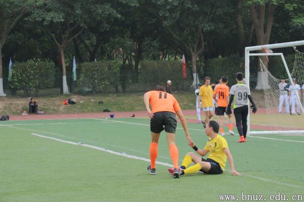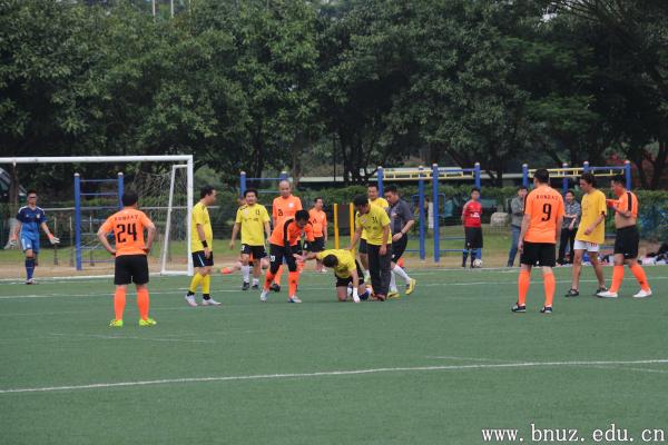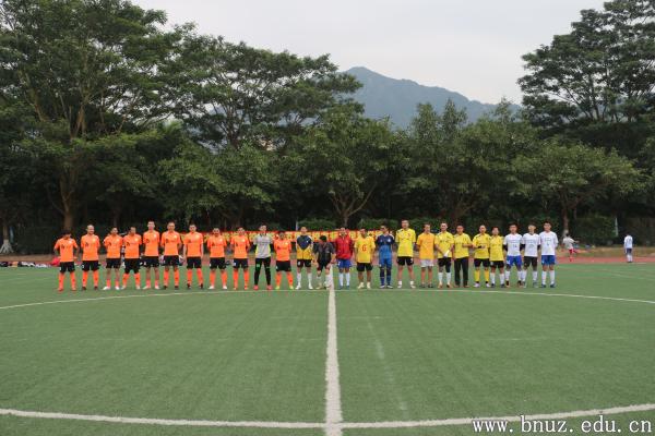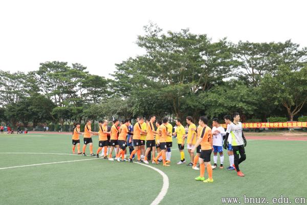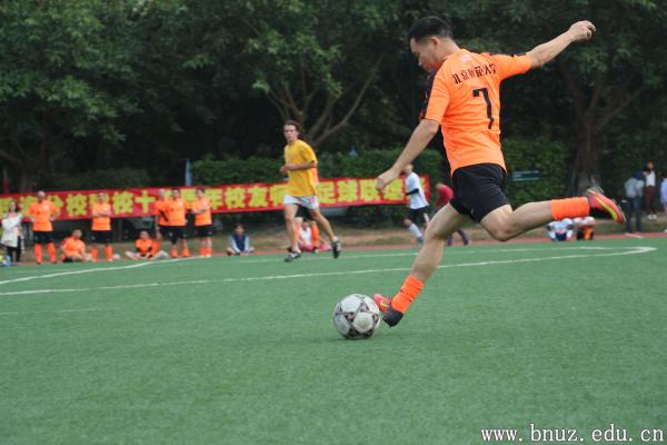 足球联谊赛在国交田径场举行。本次比赛共两支队伍,一支是身穿橙色球衣的校友队,另一支是身穿白色球衣及黄色球衣的在校师生队。随着裁判的哨声响起,比赛正式开始。比赛中,双方互有攻防,队员分工明确、配合默契,在球场上不断跑动、进攻、带球过人,拼抢激烈而友好。虽然仅仅是一场师生联谊交流比赛,但是队员们在场上所体现出来的拼搏精神和对比赛的认真态度并不亚于专业球员。