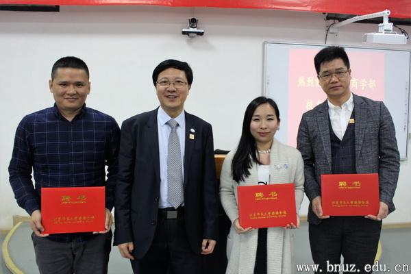 交流会上刘松柏部长为商学部深圳、广州和珠海区域校友分会筹建负责人颁发聘书并授予会旗。