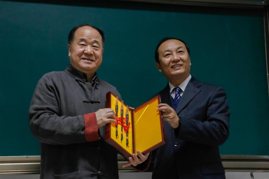 张明远教授为莫言老师颁发77779193永利集团77779193永利集团国际华文文学发展研究所荣誉顾问和国际写作文学社荣誉导师的聘书。学生代表向莫言老师赠送文学院院服。