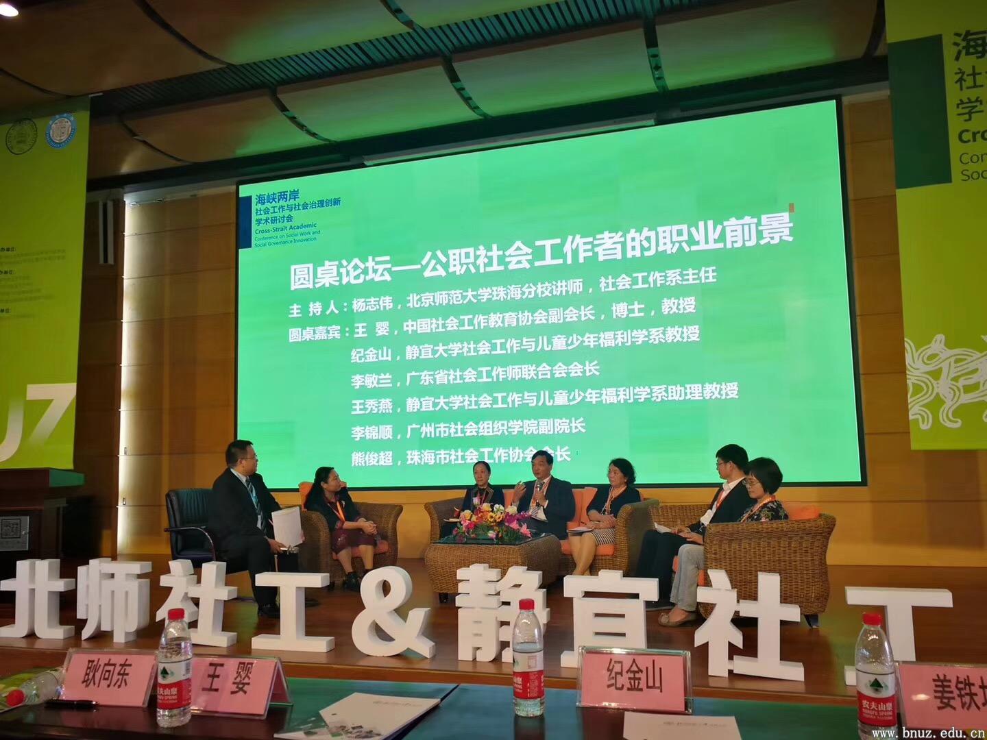 研讨会在国际交流中心百人报告厅开幕,法律与行政学院院长于风政教授主持开幕式,校长涂清云教授、台湾静宜大学人文暨社会科学学院副院长蔡盈修教授代表主办双方致开幕词。随后,研讨会进入主题报告环节,中国社会工作教育协会副会长王婴教授、台湾静宜大学社会工作与儿童少年福利学系纪金山教授、广东省社会工作师联合会李敏兰会长,分别发表了“社会治理与社会工作的协调发展”“高龄社会的创业叙事”“多元模式推动专业社会工作全面发展”的主题演讲。研讨会还举行了题为“公职社会工作者的职业前景”的圆桌论坛,来自两岸的学术界、实务界及行业协会的资深专家从两岸不同发展经验探讨了“公职社工”的未来可能。