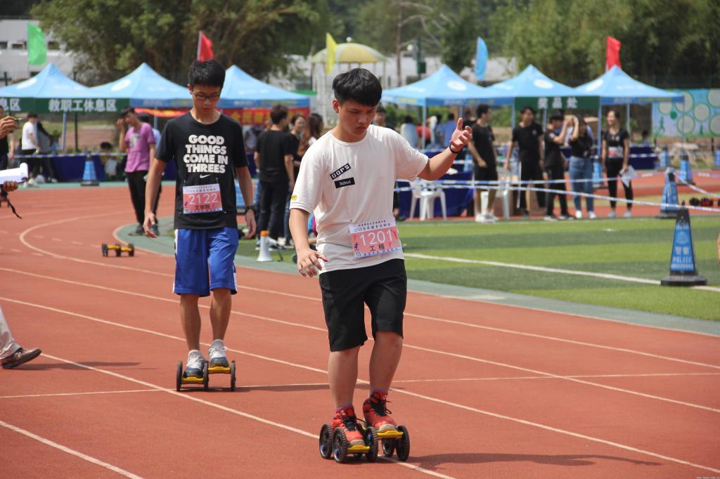 平板车是一项很有意思切特别的运动,对自己的平衡能力很有挑战,很喜欢校运会设立的这个项目,让我们都能参与进来,希望自己能取得一些成绩,对自己也是一种鼓励!