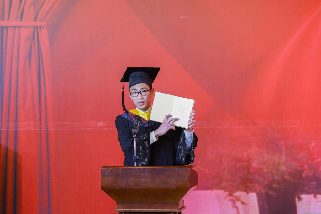 十佳毕业生代表许铭波同学代表全体毕业生发表毕业感言。他回顾了四年大学时光给予自己成长的积极影响,表达了对母校的留恋之情。他表示,今后定会牢记母校领导和老师们的殷切期望,牢记并践行“学为人师,行为世范”的校训精神以及“治学修身,兼济天下”的育人理念,张开双臂,拥抱未来,投身社会,实现自我,为祖国争光,为母校添彩。