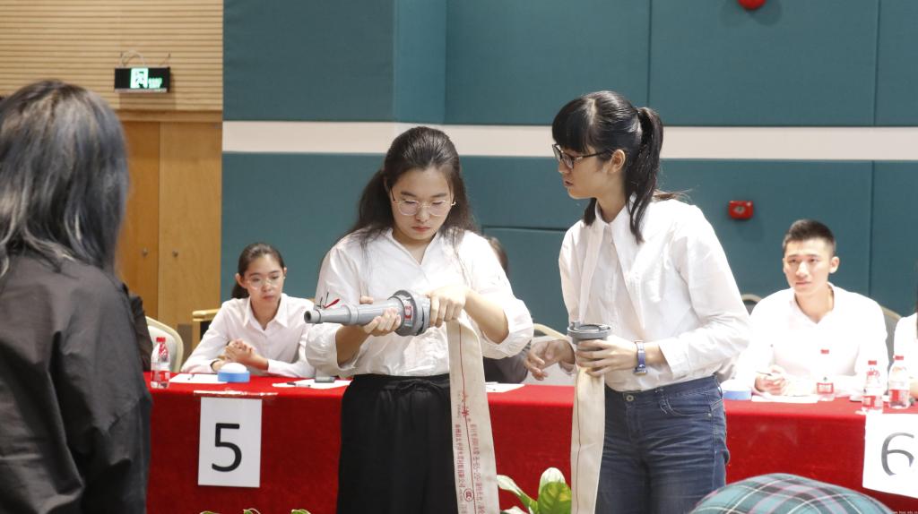本次消防知识竞赛共分为4个环节,由必答题环节,选答题环节,抢答题环节及消防器材实操环节组成,题目涉及消防法律法规、学生宿舍火灾的预防、违纪处分办法、灭火与自救以及逃生的方式方法等知识。经初赛选拔晋级决赛的6支队伍展开了紧张而激烈的角逐。在完成消防器材实操环节后,消防官兵和保卫处老师为同学们演示了规范的消防器材和设备设施的使用方法,并指导同学们进行实操演练。最终,来自燕华苑7栋的2018级新生队伍脱颖而出获得冠军。