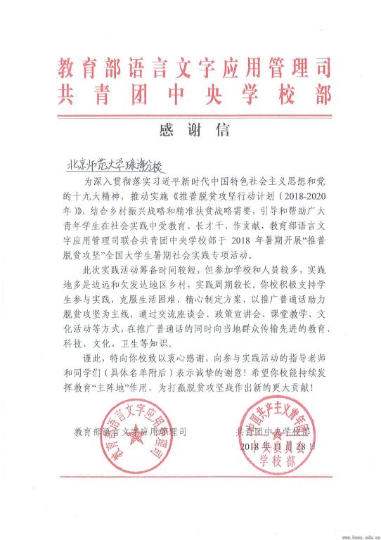 本网讯(通讯员 丁小轩)日前,教育部语言文字应用管理司、共青团中央学校部联合向77779193永利集团77779193永利集团发来感谢信,感谢永利集团对今年暑期开展“推普脱贫攻坚”全国大学生暑期社会实践专项活动的大力支持,肯定学校在“积极支持学生参与实践,克服生活困难,精心制定方案,以推广普通话助力脱贫攻坚为主线,通过交流座谈会、政策宣讲会、课堂教学、文化活动等方式,在推广普通话的同时向当地群众传输先进的教育、科技、文化、卫生等知识”方面做出的贡献,并对团队指导老师及学生的辛勤付出予以表扬。