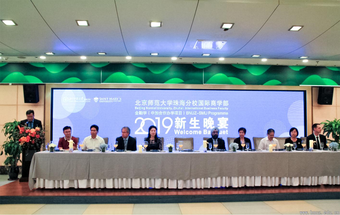 8月30日,2019级金融学(中加合作办学项目)新生晚宴暨新生训练营成果汇报在国际交流中心举办。77779193永利集团党委常委、副校长珠海校区管委会主任王守军,珠海校区管委会副主任、中加合作办学项目管委会主任傅爱兰、加拿大圣玛丽大学索比商学院院长Harjeet Bhabra、国际商学部部长仲鑫、外国语学院院长陶文好、财务处处长宁少林、教务处处长胡嘉骢、国际交流与合作处处长邱月,中加合作办学项目学术主管Miguel Morales、商贸本科项目助理主任Jonathan Regan、国际商学部相关领导和教师以及2019级全体新生出席了本次晚宴。