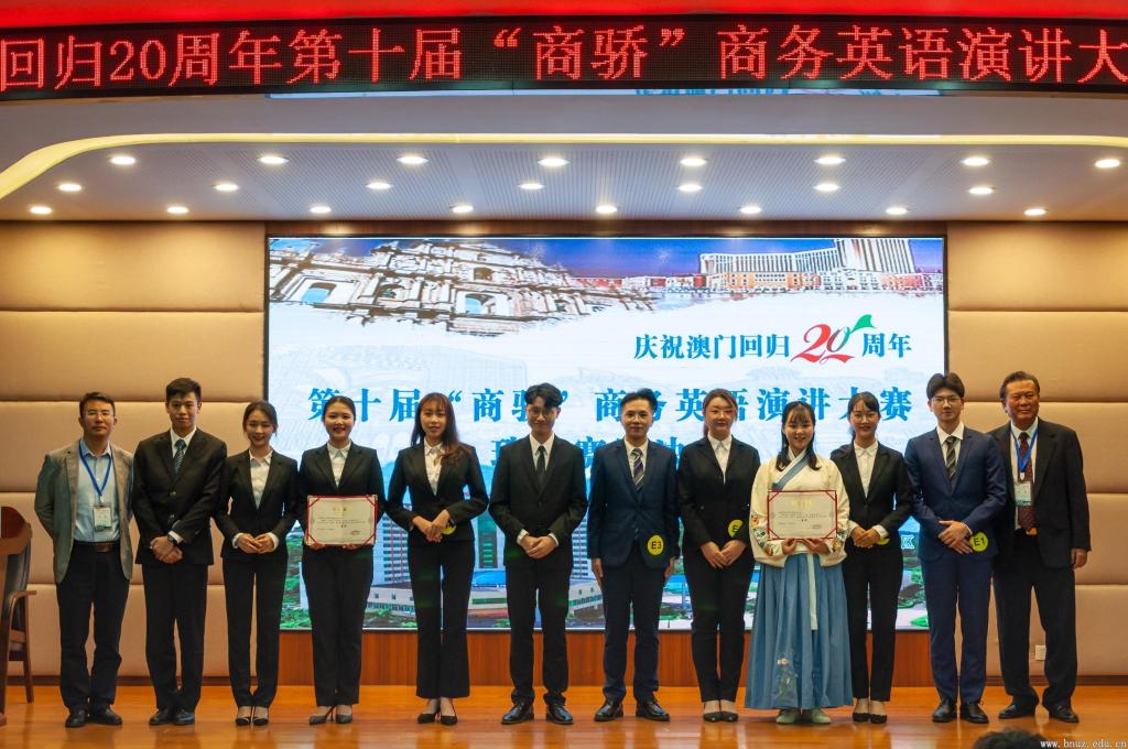 本网讯(通讯员 罗敏)为庆祝澳门回归20周年,2019年12月28日,澳门第十届“商骄”商务英语演讲大赛珠海赛区决赛在遵义医科大学珠海校区举行。经过激烈角逐,由来自外国语学院的娜仁易华、李泽林、朱蕊,国际商学部的田知欣以及物流学院的李浩轩五位同学组成的77779193永利集团77779193永利集团代表队勇夺决赛一等奖,将代表珠海赛区参加在澳门举办的总决赛。