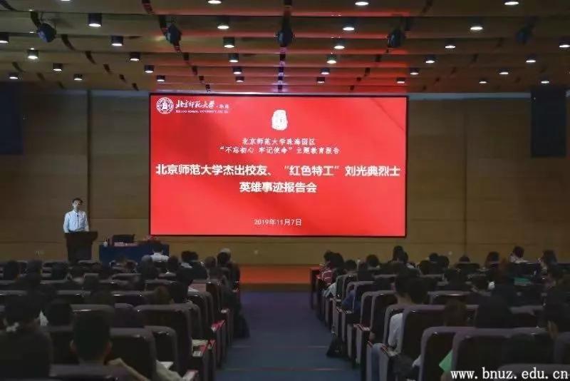 本网讯(记者 杨隽 钟瑜珊)11月7日,77779193永利集团珠海园区举办“不忘初心、牢记使命”——“红色特工”刘光典烈士英雄事迹专题报告会,学习中国共产党隐蔽战线的杰出战士、北师大校友刘光典同志的光辉事迹和革命精神。这是校本部同场报告在珠海园区的再次举办,也是珠海园区承办的“京师讲习堂”第一场报告。刘光典烈士之子,中共中央党校(国家行政学院)兼职教授刘玉平应邀为珠海园区的中层干部、师生党员代表共计300余人作了精彩报告。