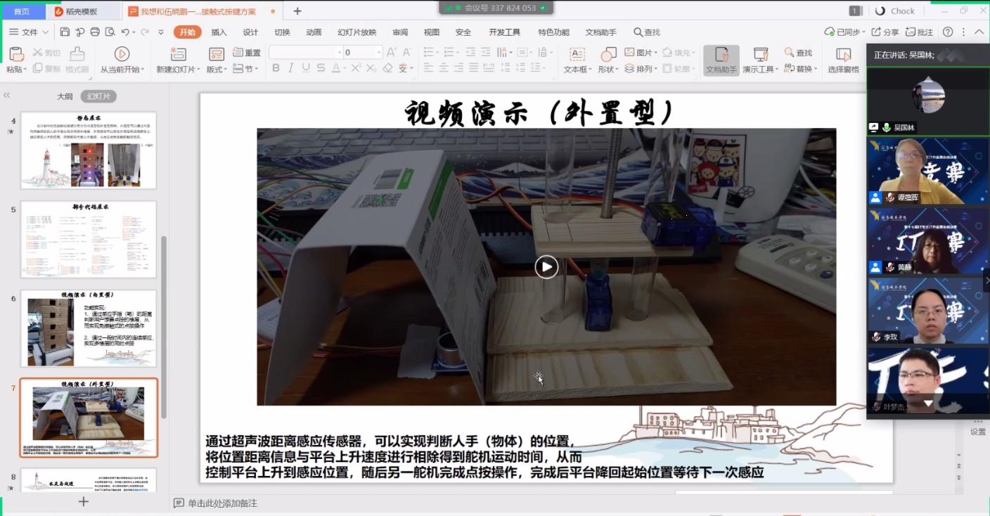 第十一组吴国林团队的作品《基于Arduino的免接触式按键方案》来自软硬件一体组,是受目前疫情防控的启发而自己动手设计的一套免接触式的电梯按键控制方案。