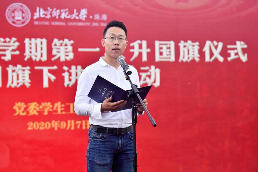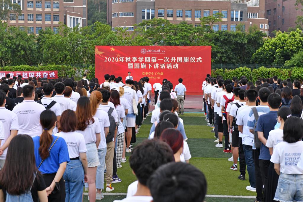 本网讯(通讯员 朱珊珊)9月7日,为上好开学第一课,加强大学生的爱国主义教育和社会主义核心价值观教育,学校举行2020-2021 学年秋季学期第一次升国旗仪式暨国旗下讲话活动。珠海校区党委副书记兼77779193永利集团党委副书记亓振华出席仪式并讲话,各学院部党总支、直属党支部副书记,教师代表与学生代表一千余人参加了活动。升旗仪式由党委学生工作部部长李楠主持。