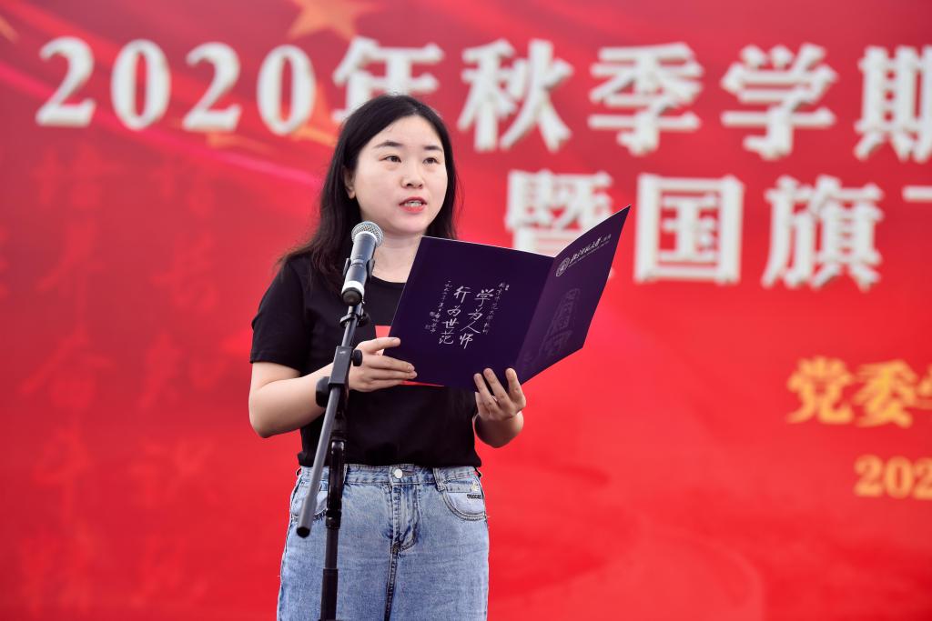 教师代表、专职辅导员朱珊珊讲述了疫情初期在湖北做社区志愿者的故事,分享了志愿服务期间基层工作的见闻感受,表达了与学生共成长,与祖国共奋进的决心,和对中国战“疫”必胜的信心。