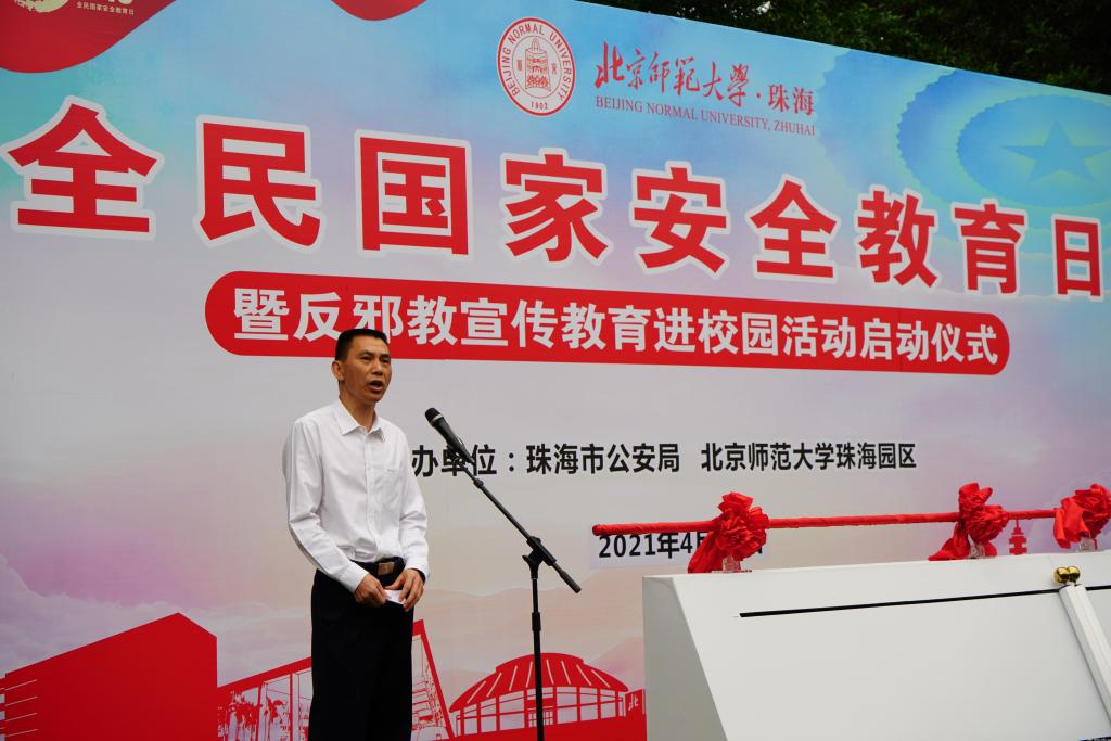韦蔚在讲话中表示,国家安全教育是全社会的共同责任,珠海园区处在改革开放前沿,在国家安全教育方面理应走在前列、发挥示范引领作用。近年来,在公安部门的指导和支持下,学校高度重视,不断完善“三全育人”体系,成立了国家安全与应急管理学院,为国家安全和应急领域的人才培养和科学研究中贡献北师力量。她提出三点要求:一是校内各部门要认真落实各级政府要求,持续深入开展国家安全教育活动和“反邪教宣传教育进校园活动”;二是全体师生要紧紧围绕“践行总体国家安全观,统筹发展和安全,营造庆祝建党100周年良好氛围”的主题,结合党史学习教育,认真学习法律法规,认清国家安全形势,增强危机意识、忧患意识、使命意识,崇尚科学、反对迷信、抵制邪教、健康工作和学习;三是各单位要落实普法责任制,进一步增强宣传教育的实效,要教育引导广大师生尊法学法守法用法,校园内禁止一切宗教活动,坚决对邪教说“不”。