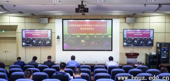 会议指出,党的十九届六中全会是在我们党百年华诞的重要时刻,在“两个一百年”奋斗目标历史交汇关键节点上召开的一次重要会议。会议全面总结党从胜利走向胜利的伟大历史进程、为国家和民族建立的伟大历史功绩、百年奋斗所积累的宝贵历史经验,体现了我们党重视和善于运用历史规律的高度政治自觉,体现了我们党牢记初心使命、继往开来的自信担当,对于推动全党更加紧密地团结在以习近平同志为核心的党中央周围,进一步增强“四个意识”、坚定“四个自信”、做到“两个维护”,团结带领全国各族人民夺取新时代中国特色社会主义新的伟大胜利,具有重大现实意义和深远历史意义。习近平总书记在全会上所作的工作报告和重要讲话,全面总结、充分肯定了党的十九届五中全会以来中央政治局的工作,阐明了起草《中共中央关于党的百年奋斗重大成就和历史经验的决议》的主要考虑、突出特点和重要内容,就学习贯彻全会精神和学习总结党史提出了明确要求,科学回答了一系列方向性、根本性、战略性重大问题,提出了许多新思想新观点新论断,为我们党团结带领人民再创伟业、续写荣光提供了根本遵循。全会审议通过的《决议》,是一篇具有极强历史穿透力、思想引领力、政治动员力、时代感召力的马克思主义纲领性文献,是新时代中国共产党人牢记初心使命、坚持和发展中国特色社会主义的政治宣言,是以史为鉴、开创未来、实现中华民族伟大复兴的行动指南。《决议》强调确立习近平同志党中央的核心、全党的核心地位,确立习近平新时代中国特色社会主义思想的指导地位,反映了全党全军全国各族人民共同心愿,对新时代党和国家事业发展、对推进中华民族伟大复兴历史进程具有决定性意义。全省教育系统广大党员干部、全体师生完全拥护习近平总书记所作的工作报告、发表的重要讲话,完全拥护全会审议通过的《决议》。坚决按照习近平总书记、党中央的部署要求,教育引导干部师生学习宣传贯彻好六中全会精神,在真学真信中坚定理想信念,在学思践悟中牢记初心使命,在细照笃行中不断修炼自我,在知行合一中主动担当作为。