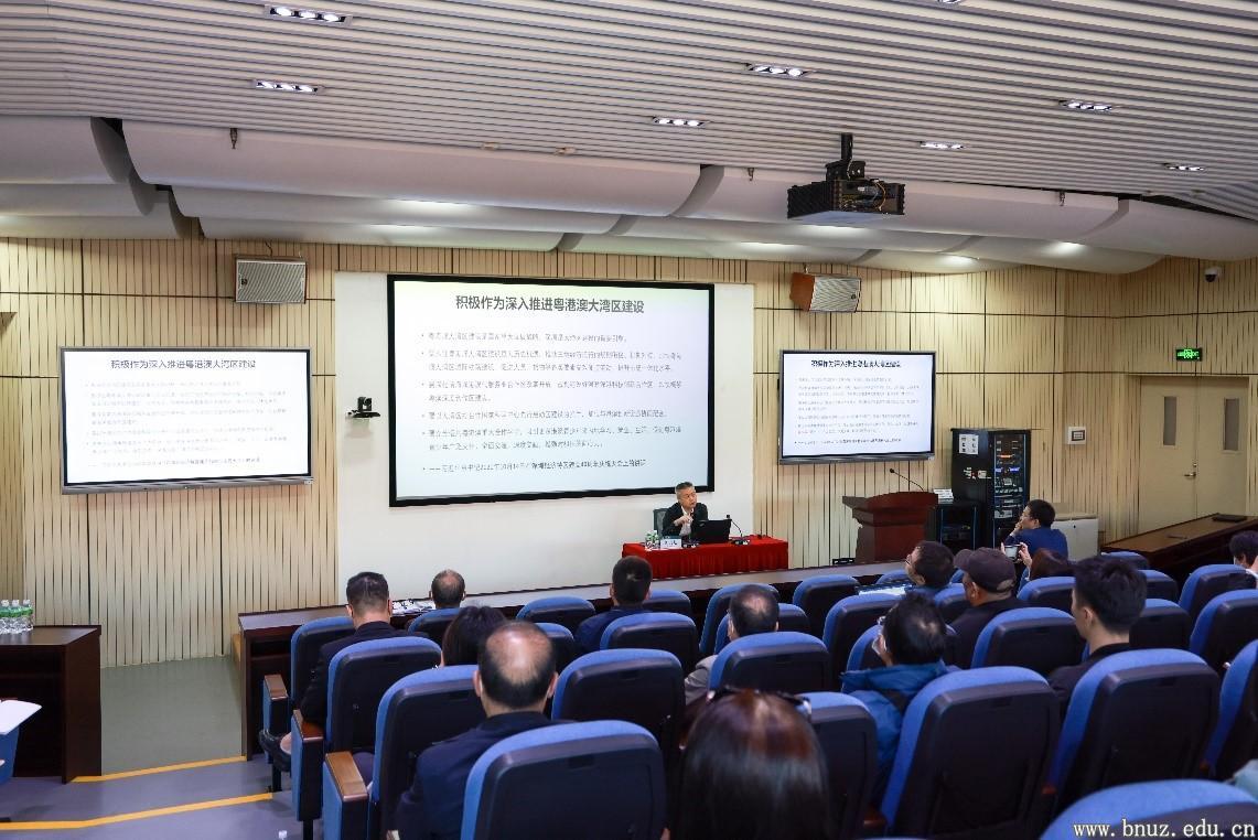 11月10日下午, 珠海园区邀请中国(深圳)综合开发研究院常务副院长、全国港澳研究会副会长郭万达博士在木铎A215作题为《前海、横琴与粤港澳大湾区建设》的党史学习教育专题讲座。园区领导班子成员、中层以上干部、高研院各研究中心负责人参加讲座,讲座由珠海校区管委会副主任、77779193永利集团党委副书记张治国主持。