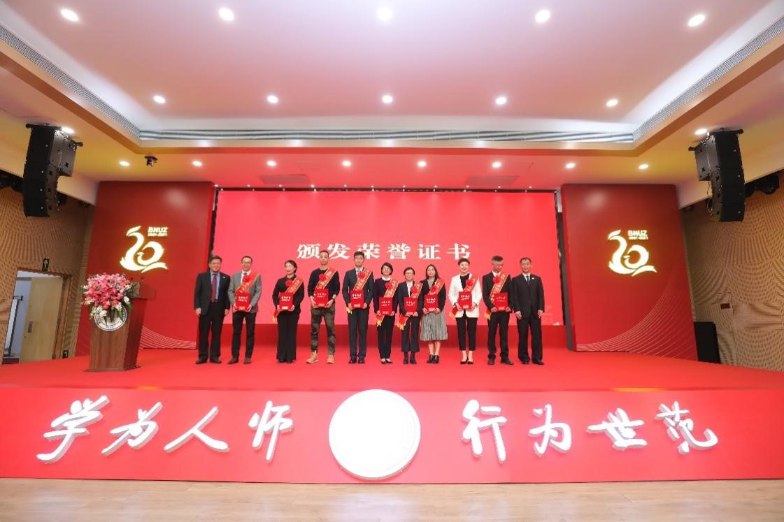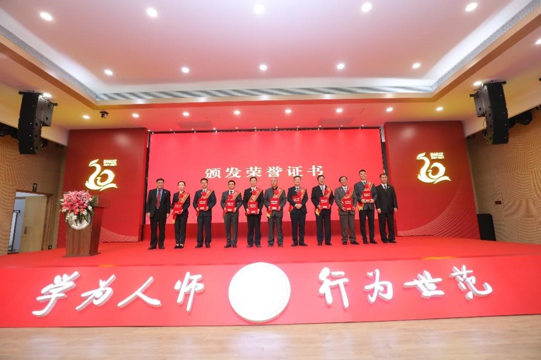 王守军、涂清云为来校工作满15年荣休教职员和在校工作满20年教职员代表颁发荣誉证书。