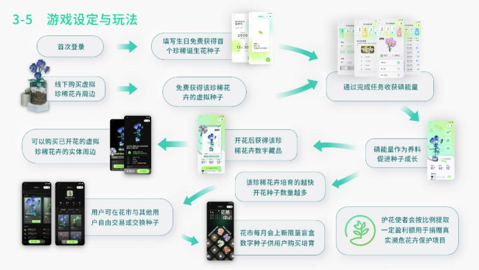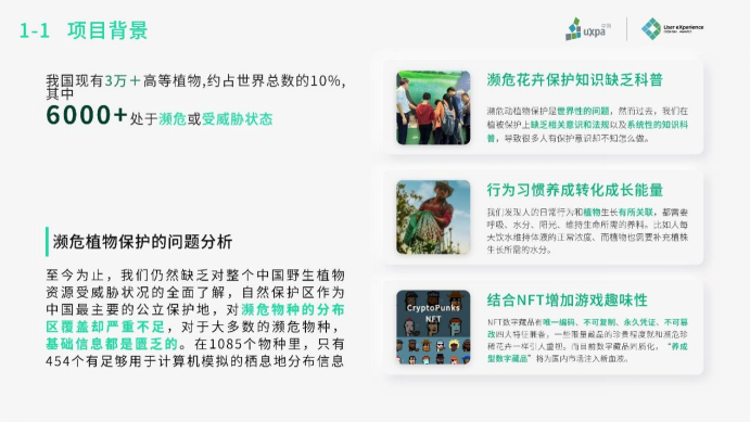 由于大众普遍缺乏一个系统的了解濒危花卉相关内容的平台,并对普通的科普方式不太容易接受,所以我们将游戏、NFT、行为习惯养成三者结合,在游戏中将濒危花卉保护意识潜移默化的科普给用户。