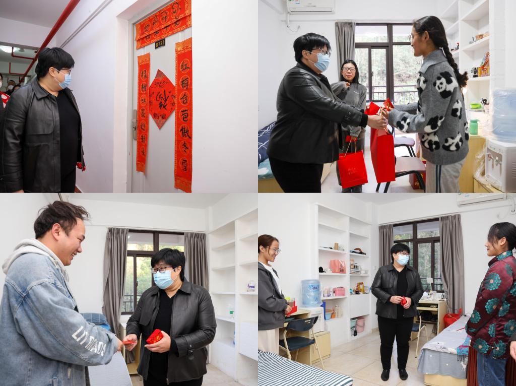 在文华苑学生宿舍,慰问组一行向留校学生送上节日的温暖问候和新春的美好祝福。他们与同学们亲切交谈,倾听学生需求,了解大家的留校安排,询问同学们寒假在校的生活学习情况,叮嘱同学们要做好个人健康管理、合理安排假期生活、多与家人联络沟通。同学们对学校细致周到的安排和校领导的关心关爱表示了感谢,大家纷纷表示,一定会把学校的关心关爱转化为提升自我的强大动力,充分利用假期充电,在新的一年里踔厉奋发,笃行不怠。