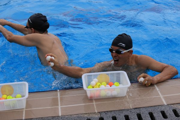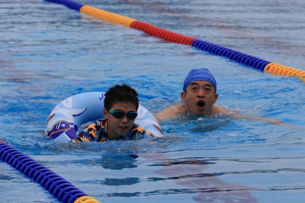 除了竞赛项目外,趣味项目更是让孩子们和潜水爱好者尽情享受了游泳的乐趣。在“快乐之家”比赛中,泳圈里的孩子们在水面上漂浮,摆动双臂向后划水,老师们在后面游泳驱动助力,就像是一只只敏捷的小鸭。参赛的组合同样热情四射,孩子们的参与为游泳比赛增添了一抹童真,为亲子关系、家庭关系带来更多的温馨。在“集龙珠”比赛中,水面和池底散布着许多“龙珠”,不同的“龙珠”代表不同的分数,选手们要想赢得高分,就需要根据自身的能力,在规定时间内捞取尽可能多的“龙珠”。比赛开始后,老师们争先恐后地跳进水里“寻宝”。最终,自然科学高等研究院的陈升以91分取得男子青年组第一名,设计学院的杨子滢以122分夺得女子青年组最高分,未来设计学院的Christoph以75分取得男子中年组第一名,管理学院的罗永红以88分夺得女子中年组最高分。