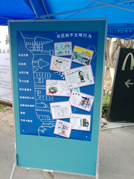 丽泽湖平常似镜,北师景色最宜秋。美丽的丽泽湖畔,嘉年华活动火爆进行中,活动现场,学生社区辅导员办公室的老师和同学们设置了近30个展位和41个展板,占据展位的半壁江山的当属今天的主角——高校文明行为展,这些文明行为图片收集自教室、图书馆、饭堂、生活区等校园的角角落落。