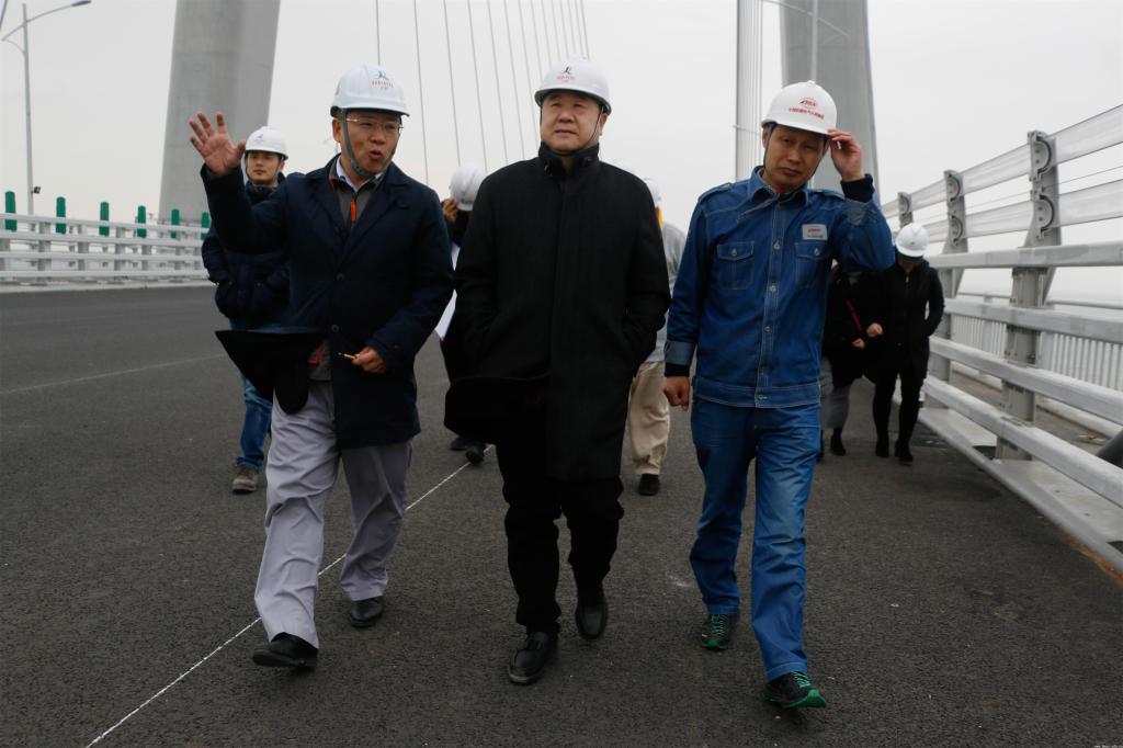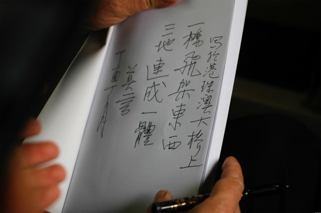 莫言一路走,一路畅谈了许多新鲜的想法。参观结束时,莫言欣然为港珠澳大桥题词:“一桥飞架东西,三地连成一体。”