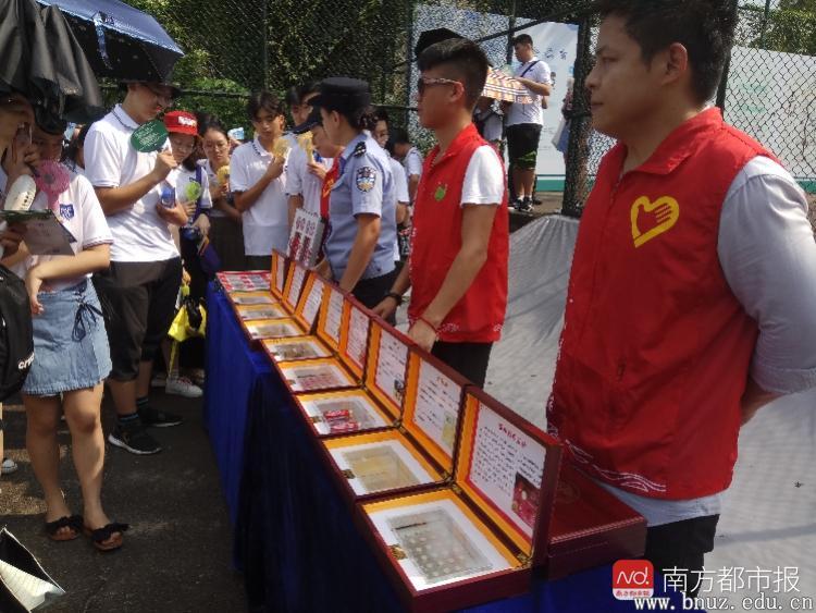 新生安全教育展所在地原是一个网球场,三面贴满全长150米的展板,还设有安全教育主题展区、安全教育视频播放区、毒品样品展示区以及消防模拟灭火器体验区。