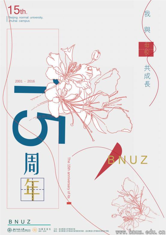 五月开花至夏末,现在正到了凤凰花开的日子。花艳似火、富丽堂皇。凤凰花分为五瓣,三朵凤凰花有15叶花瓣,具有15周年之意。红色代表着吉祥、奔放、热烈、激情和昂然的斗志,象征着年轻的北师珠和全体师生的蓬勃未来。