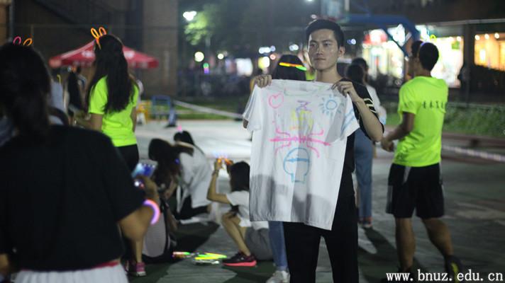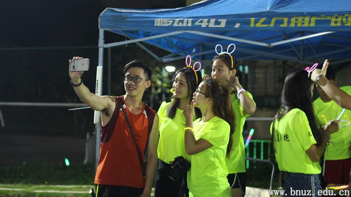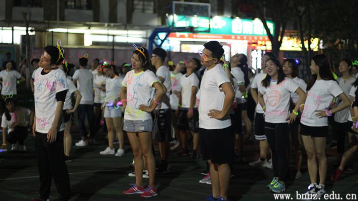 晚上九点,伴随着欢快的音乐,在领跑队员的带领下,老师和同学们跳起了“荧光健身操”,进行跑前热身。随后,在响亮的口号声发出后,“荧光夜跑”正式开跑!大家身着自制的荧光T恤、手带荧光环、挥舞荧光棒,迈着矫健的步伐,在迷人的北师社区中犹如一道斑驳的荧光带,划亮了初夏的夜空。