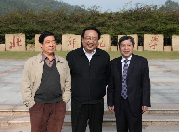 从左至右为:文学院教学科研委员会主任罗超教授、国家发改委副主任朱之鑫、代校长陈光巨教授