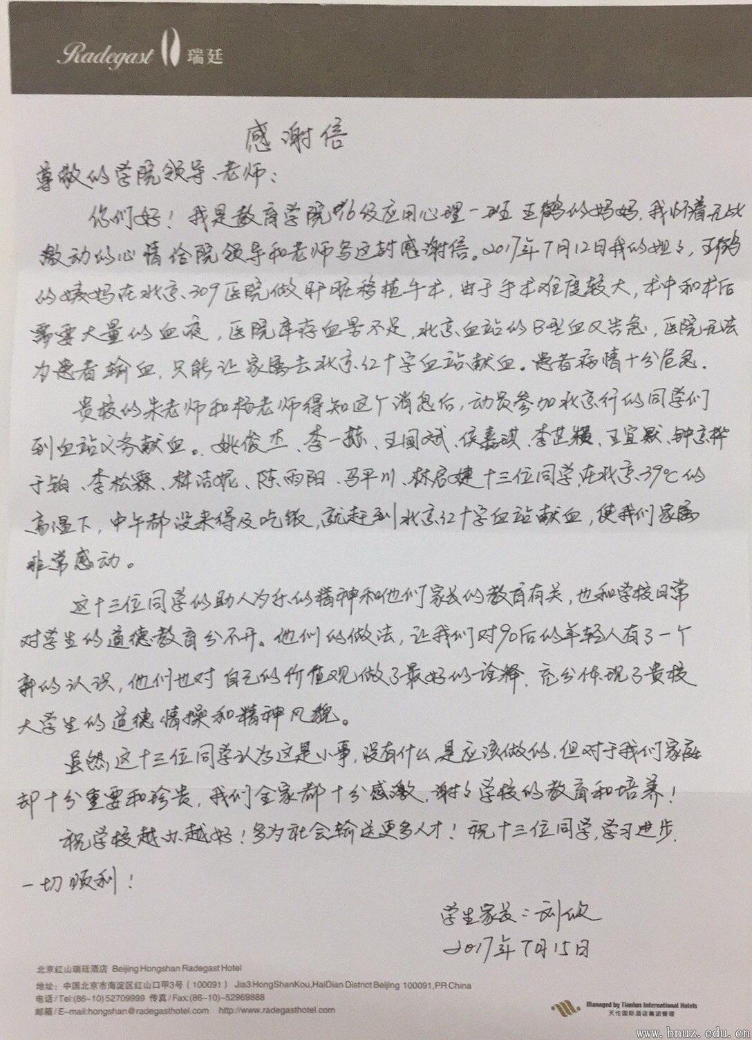 您们好!我是教育学院16级应用心理一班王鹤的妈妈。我怀着无比激动的心情给院领导和老师写这封感谢信。2017年7月12日我的姐姐,王鹤的姨妈在北京309医院做肝脏移植手术,由于手术难度较大,术中和术后需要大量的血液,医院库存血量不足,北京血站的B型血又告急,医院无法为患者输血,只能让家属去北京红十字血站献血,患者病情十分危急。