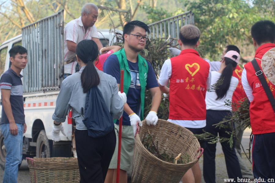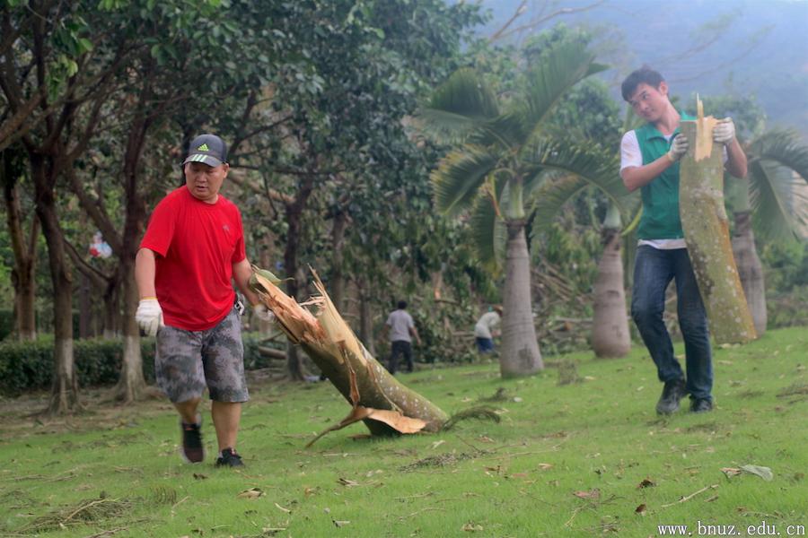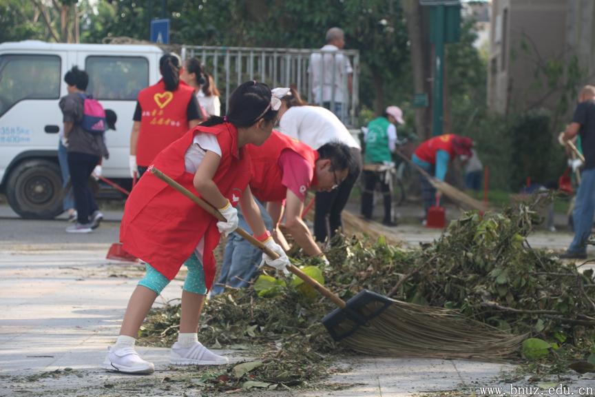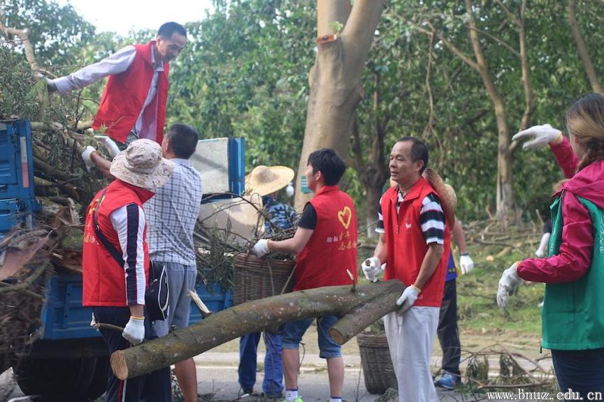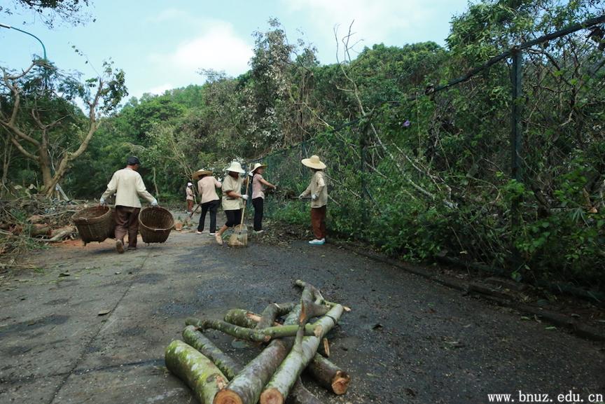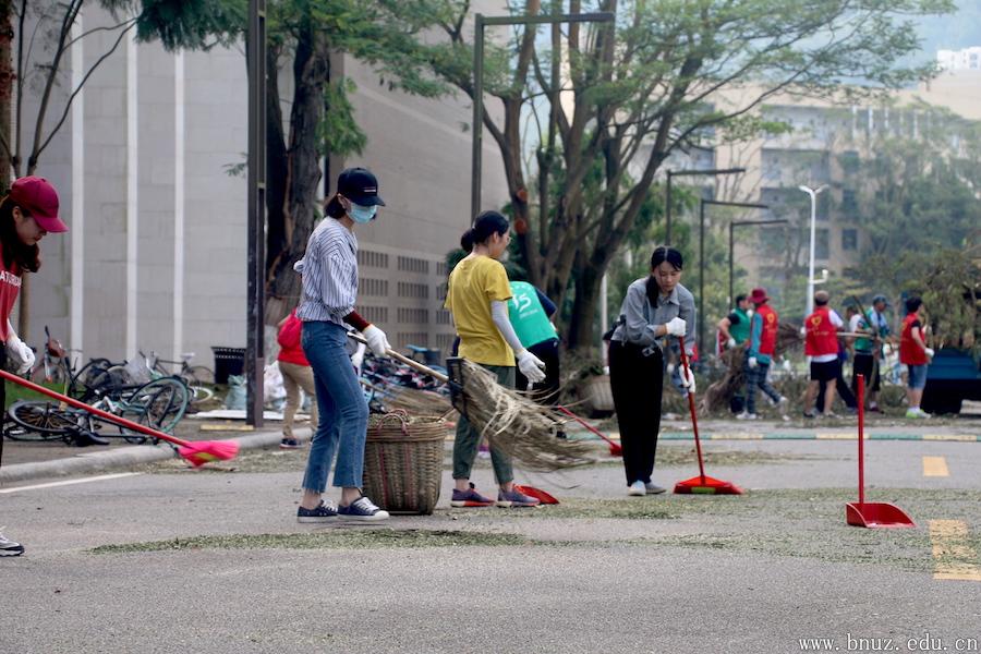 天灾无情,人间有爱。本次灾后恢复工作,得到了众多热心志愿者的积极响应,他们中有暑期在校师生、毕业校友、学生家长、尚未入学的2017级新生以及珠海市社会组织,在校团委、后勤处、学生自媒体的组织下,截止到28日,600人次志愿者协助学校各部门工作人员,参与到学校救灾工作中。文学院、外国语学院、管理学院、不动产学院、物流学院等学院和部门也积极组织师生参与救灾相关工作。运动休闲学院席连正老师、特许经营学院石元蒙老师连续两天作为志愿者活动组长,组织指挥志愿者开展救灾活动。