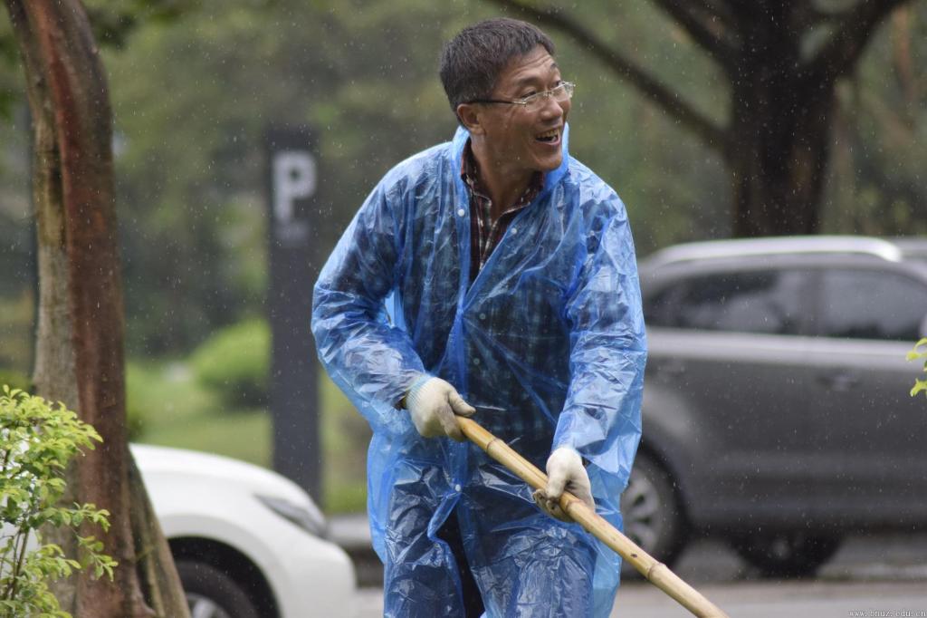 台风面前,树木倾倒,但人心不倒。运动休闲学院的周培勇老师,就是第一时间参与学校志愿救灾的带队老师。一连几天,他带领学生清理路障,清扫树枝。