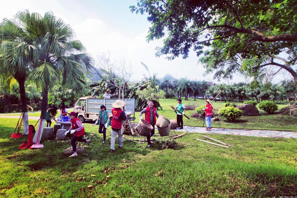 台风刚过的那几天,救灾工作尤为艰难。志愿者们常常是冒着大雨、顶着烈日、汗流浃背。他们有时体力不支,休息一会又接着干;被风吹倒的枝干树叶仅用扫帚无法清扫,就徒手捡;一个人扛不动的树干,几个人一起抬上卡车……