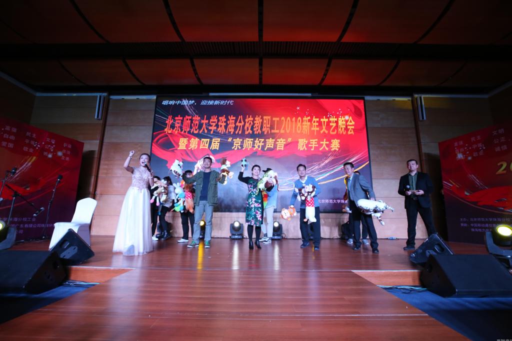 2018新年晚会暨“京师好声音”歌手大赛,包括16组选手的歌曲表演、资产公司与运动休闲学院的时装秀表演、教职工合唱团和健身舞蹈协会带来的特别演出。校党委副书记金洋出席晚会并致新年贺词,他回顾了过去一年77779193永利集团取得的办学成绩,代表学校向全体教职工表达了衷心的感谢和真诚的祝福。随后,金洋和校工会三位副主席一同向台下的观众抛掷吉祥物,给大家送上新年礼物。