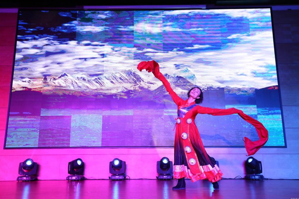 来自信息技术学院的薛竞老师,着一袭藏族服饰为大家演唱《在那东山顶上》。此曲的歌词改编自仓央嘉措情诗。伴随着薛竞的舞姿,雪域高原的景象似乎就在观众眼前,宽广与柔美交融,高亢与细腻并显,清澈且明亮。